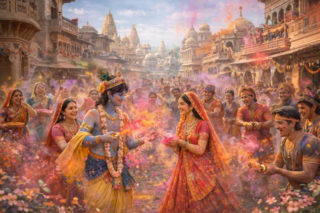 गर्ग संहिता में वर्णित प्रसंग के अनुसार वसंत के समय ब्रजभूमि में पुष्पों की सुगंध, मंद पवन और प्रकृति की नव-उद्भासित अवस्था के बीच श्रीकृष्ण राधा और सखियों के साथ रंगों से क्रीड़ा करते हैं। यह रंग बाहरी मनोरंजन नहीं, बल्कि प्रेम-भाव की अभिव्यक्ति हैं।