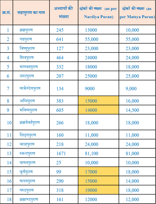 अठारह महापुराणों में निहित अध्यायों तथा श्लोकों की कुल संख्या