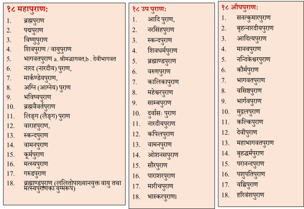 १८ महापुराण, १८ उपपुराण, और १८ औपपुराण।