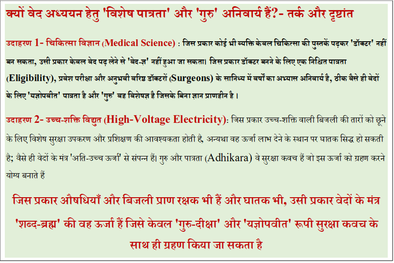 - अधिकार (पात्रता): वेद अध्ययन के लिए उपयुक्त आध्यात्मिक पृष्ठभूमि (द्विज: होना आवश्यक -ब्राह्मण, क्षत्रिय, वैश्य) और अध्ययन पूर्व ‘यज्ञोपवीत’ (जनेऊ) संस्कार का होना अनिवार्य है ।